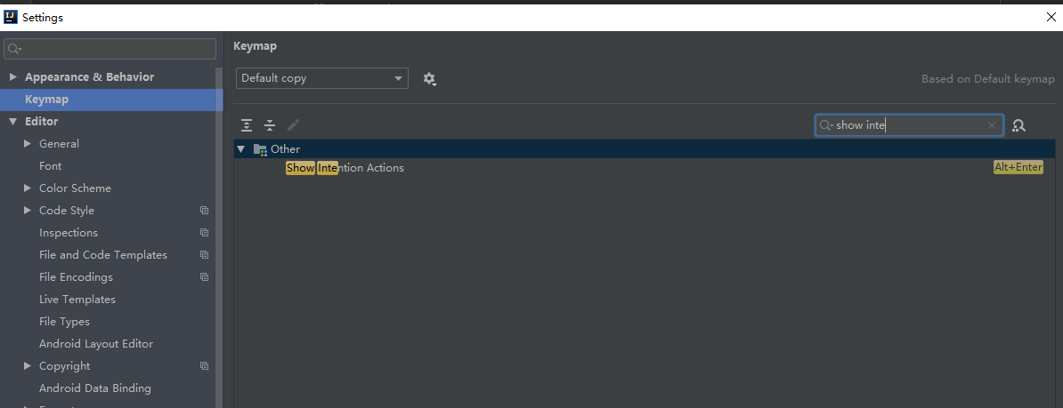 1、 进入Settings->Keymap->搜索:show Intention Actions 这个快捷键。确保默认快捷键是正确的。