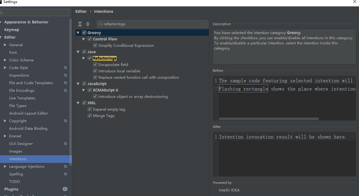 2、 Editor->intention->搜索:refactorings ,确保下述选项都勾上。