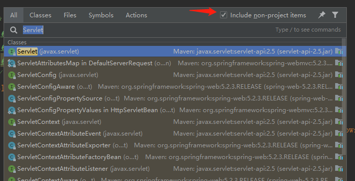 2、双击 shift,调出全局搜索框,勾选 “include non-project classes”选项 。