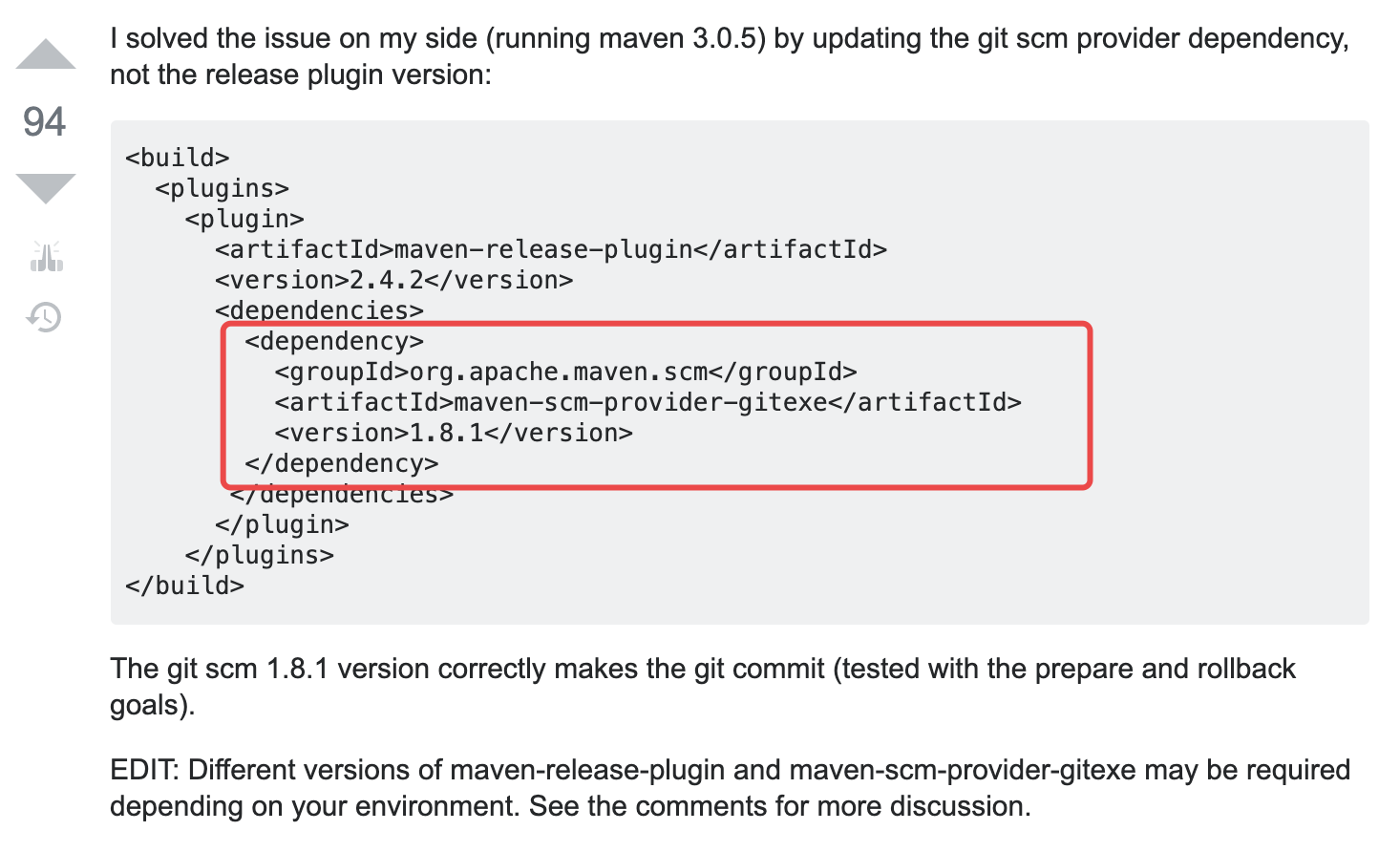 在上面的答案中,通过在 pom.xml 中通过 dependency 指定了 maven-scm-provider-gitexe 的版本为 1.8.1