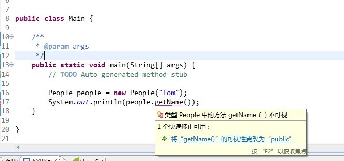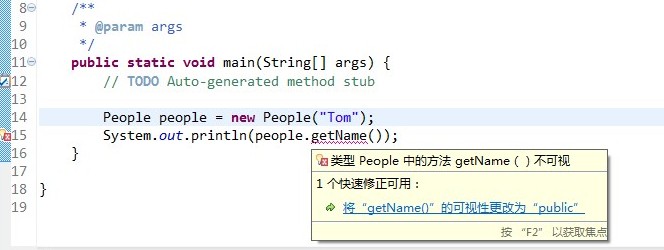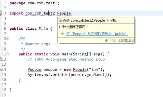 正如上图的快速修正提示所示,将People类的默认访问权限更改为public的话,People类对于Main类便可见了。