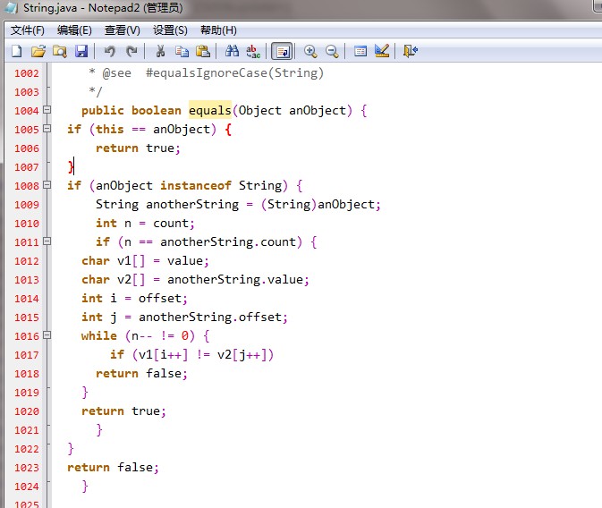 要知道究竟,可以看一下String类的equals方法的具体实现,同样在该路径下,String.java为String类的实现。