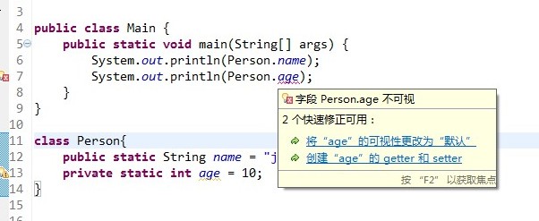 提示错误”Person.age 不可视”,这说明static关键字并不会改变变量和方法的访问权限。