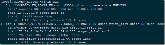 结论:通过测试可知当主HAProxy节点服务异常,Keepalived会检测到,同时HAProxy会将vip从主节点移除,备HAProxy会接管。
