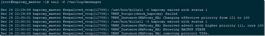 [root@haproxy_master ~]# tail -f /var/log/messages #观察HAProxy主节点日志