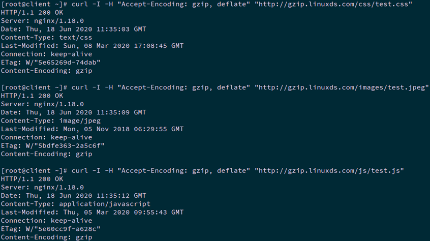3 [root@imxhy ~]# curl -I -H "Accept-Encoding: gzip, deflate" "http://gzip.linuxds.com/js/test.js"