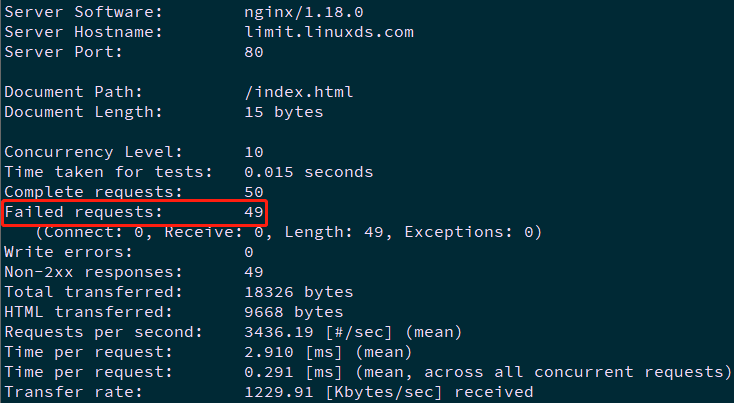 [root@client ~]# ab -n 50 -c 10 http://limit.linuxds.com/index.html