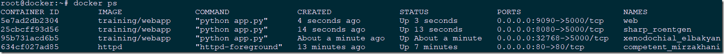 root@docker:~# docker run -d -p 9090:5000/tcp --name web training/webapp python app.py #使用--name标记可以为容器命名