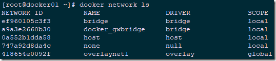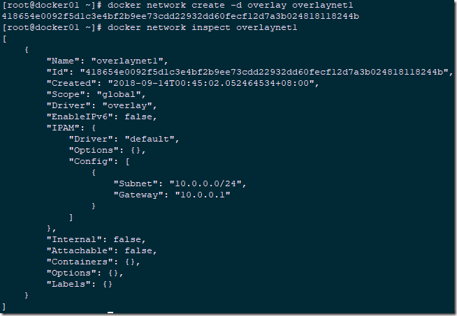 [root@docker01 ~]# docker network create -d overlay overlaynet1