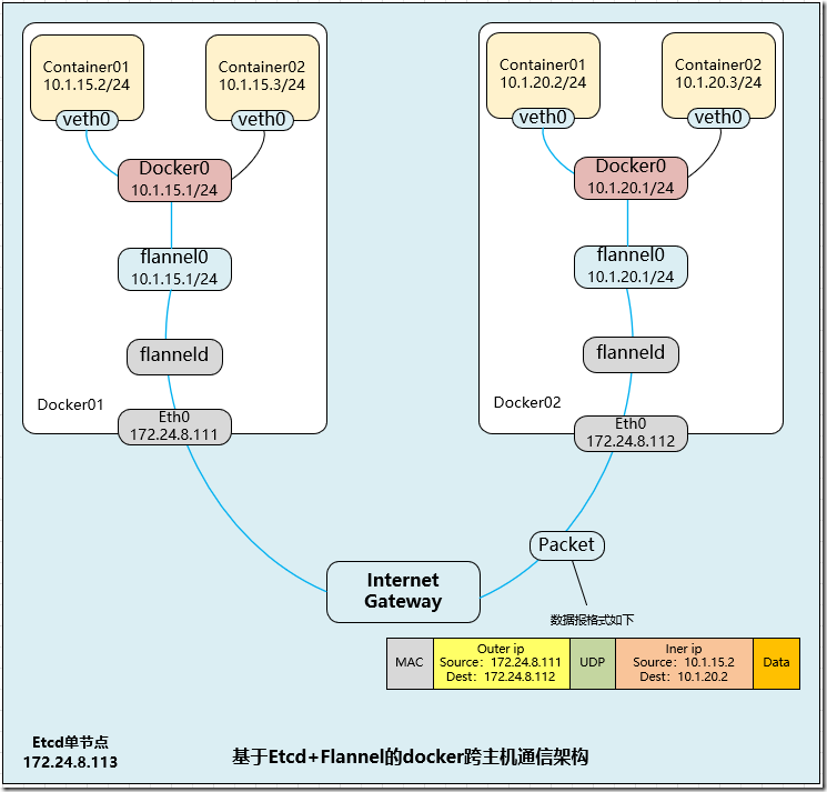 5、 flanneld通过etcd维护了各个节点之间的路由表,把原来的报文UDP封装一层,通过配置的iface发送出去。