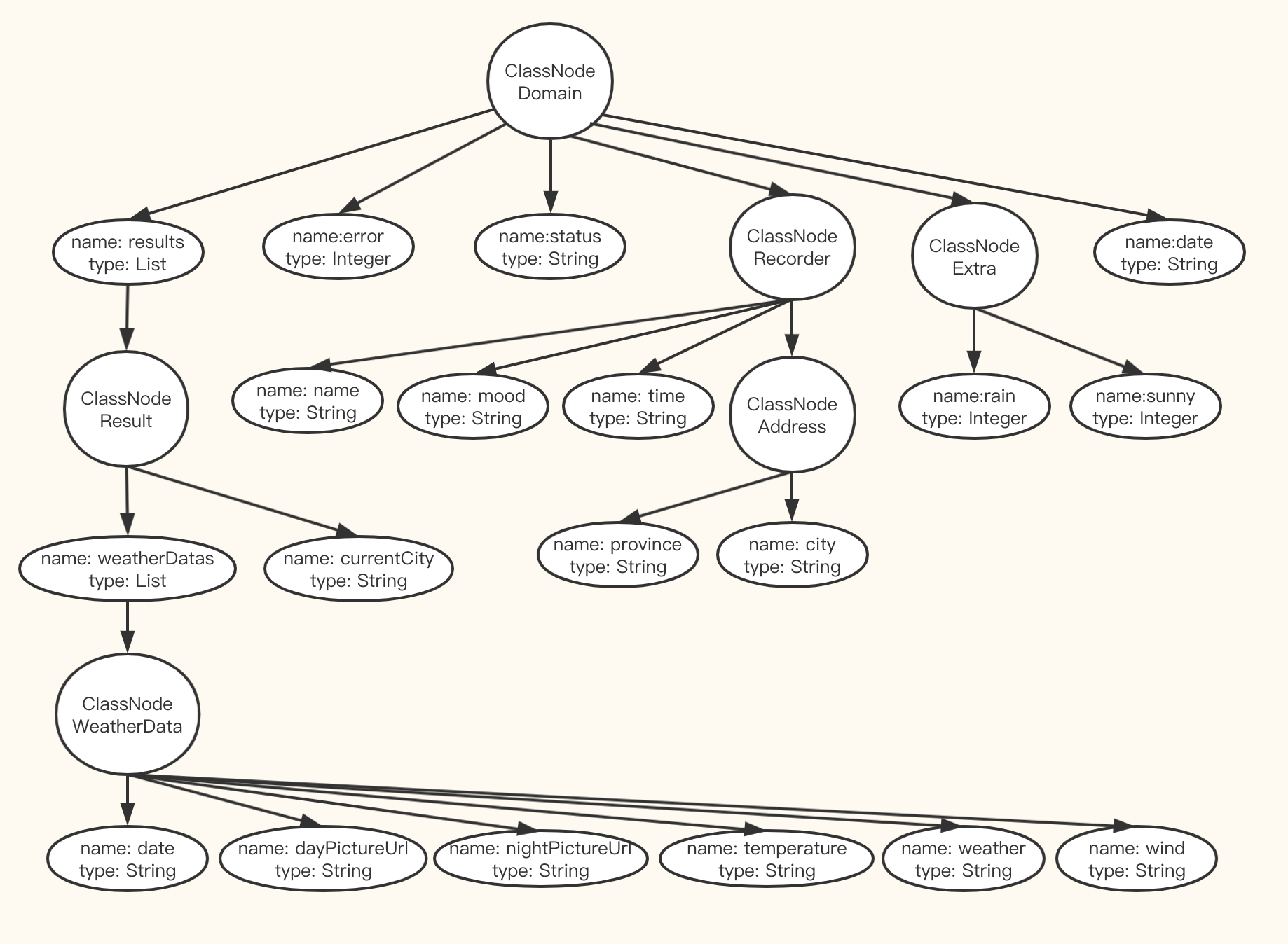 3、 值为 List : 简单起见,取第一个元素,如果是基本类型,按基本类型处理,类型为 List[Type] ;如果是 JSON ,则类型为 List[ClassName],然后再递归处理这个 JSON。