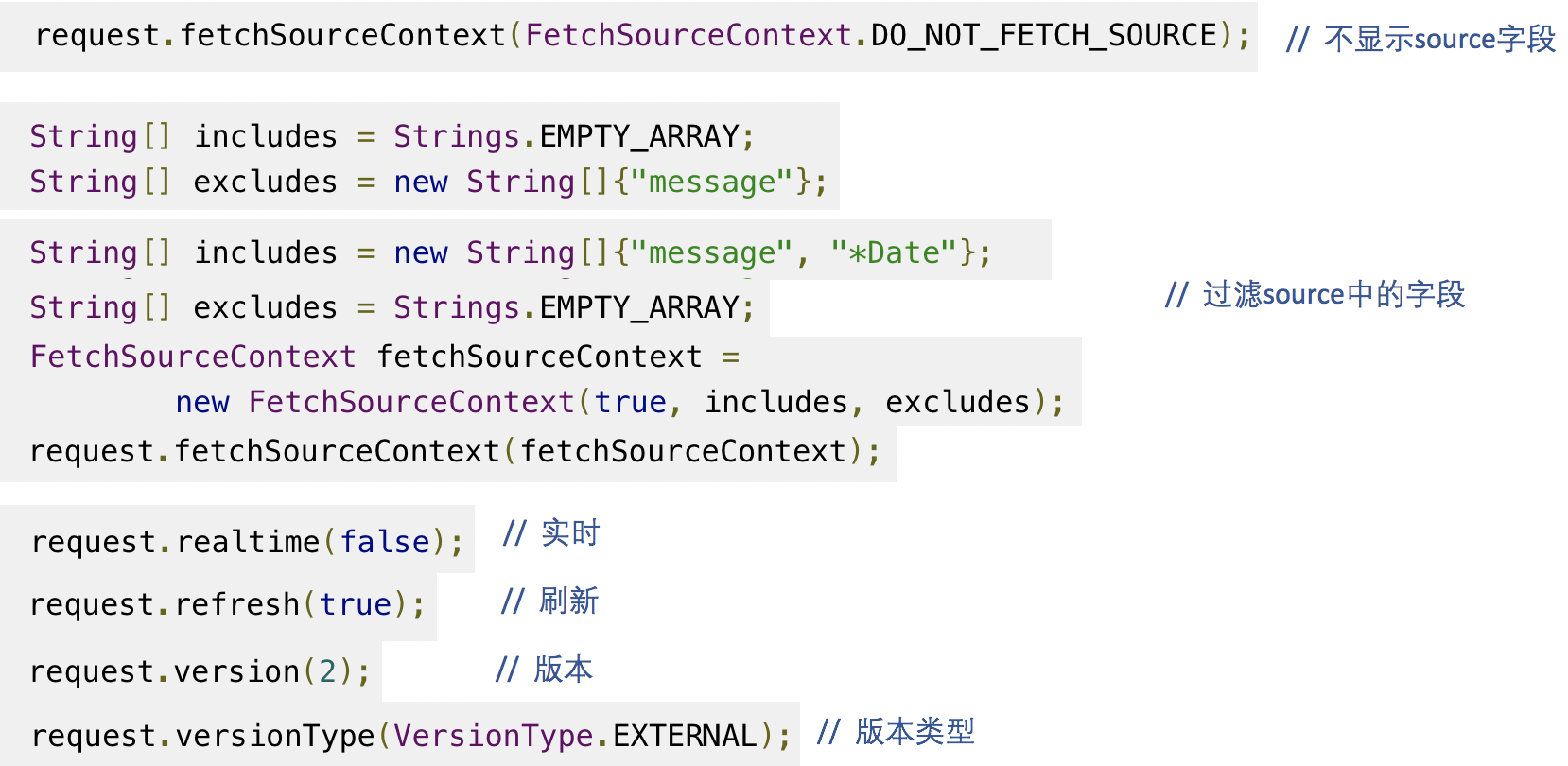 控制检索行为的大部分选项都可以在SearchSourceBuilder中设置。下面是一个常见选项的例子:
