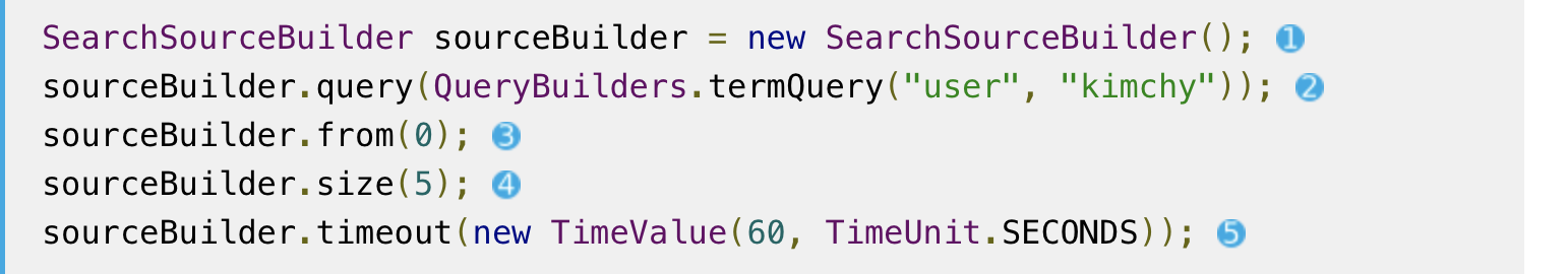 在这个例子中,我们首先创建了一个SearchSourceBuilder对象,并且带着默认选项。然后设置了一个term查询,接着设置检索的位置和数量,最后设置超时时间