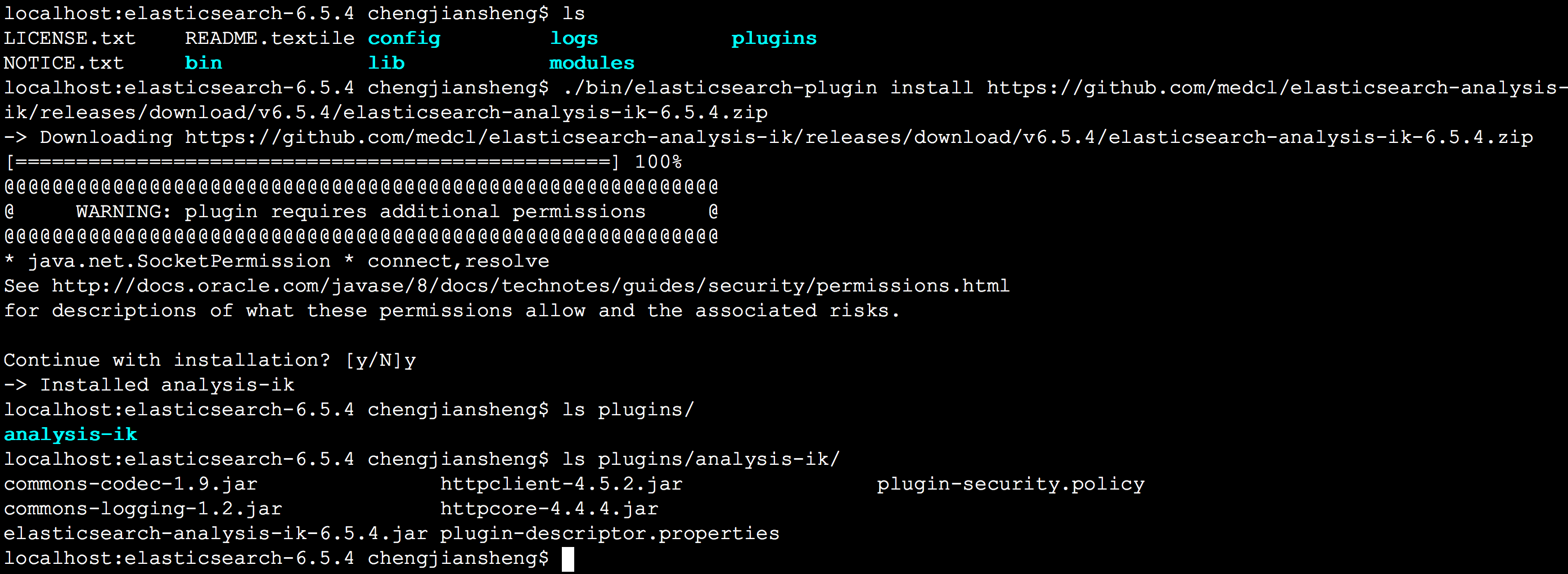 ./bin/elasticsearch-plugin install https://github.com/medcl/elasticsearch-analysis-ik/releases/download/v6.5.4/elasticsearch-analysis-ik-6.5.4.zip