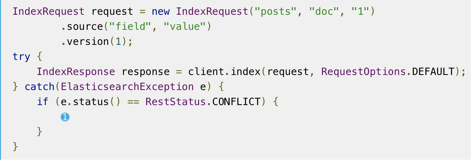 同样的异常也有可能发生在当opType设置为create的时候,且相同索引、相同类型、相同ID的文档已经存在时。例如: