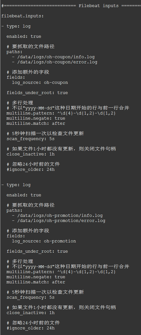 Filebeat的主要配置在于filebeat.yml配置文件中的 filebeat.inputs 和 output.logstash 区域: