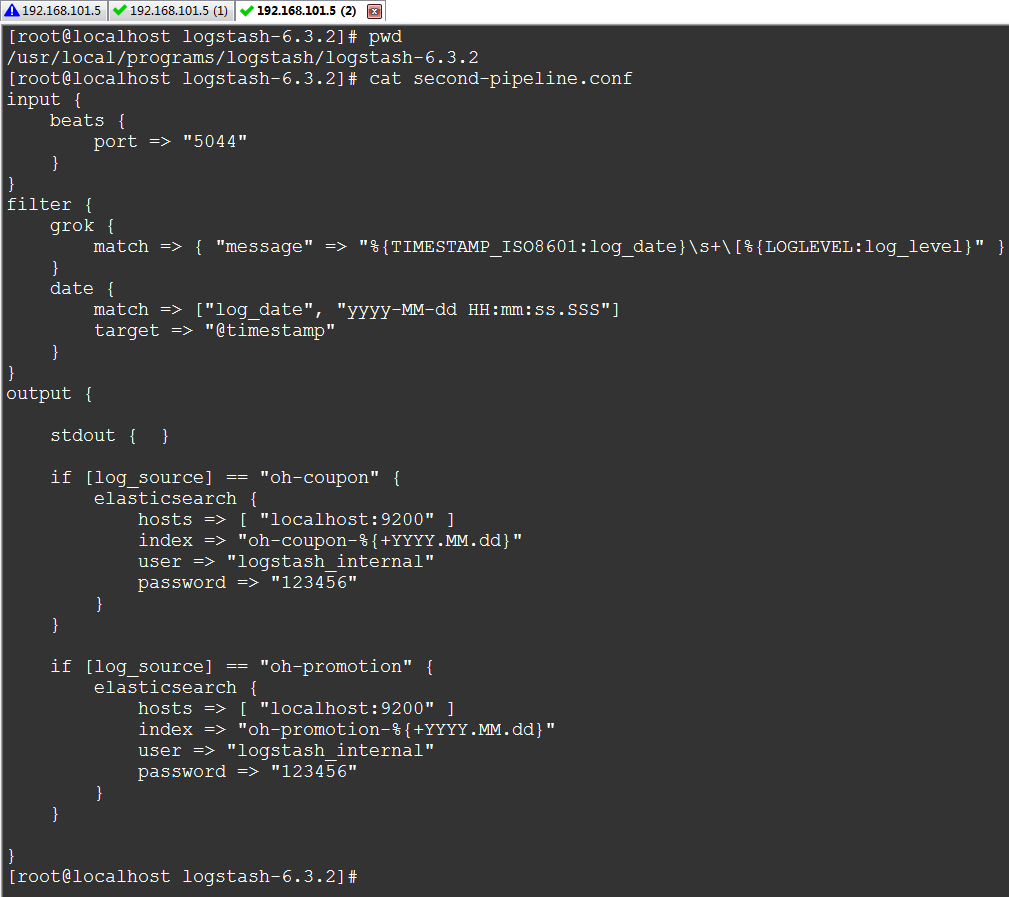 本例中,到了输入插件:beats,过滤插件:grok和date,输出插件:elasticsearch