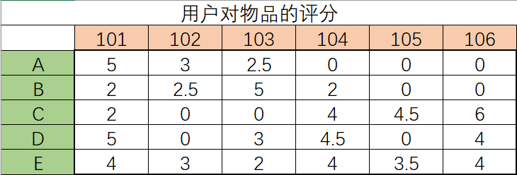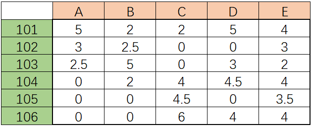 第一步、构建用于评分矩阵,表示如下: