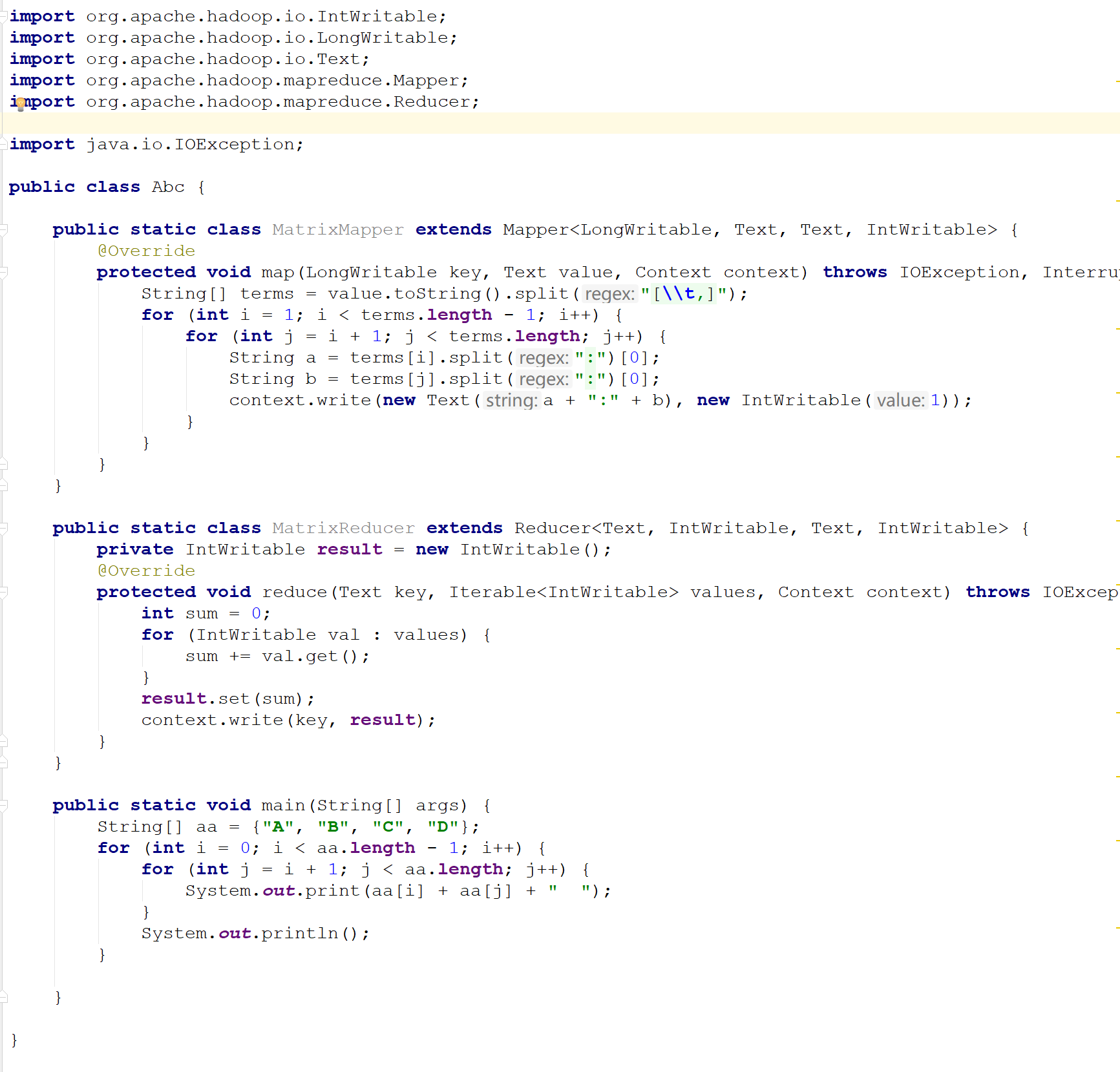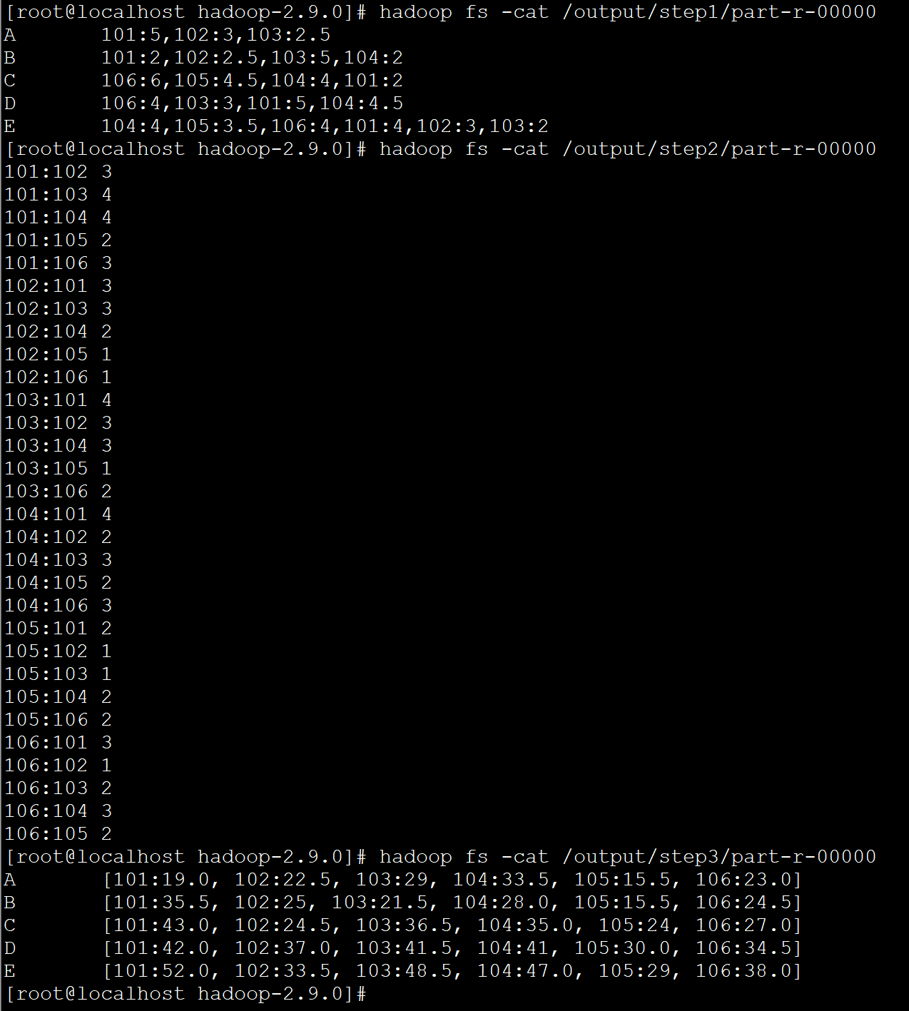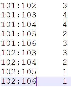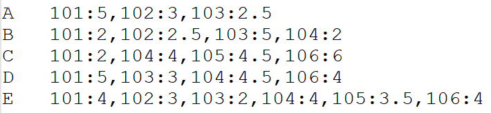 第二步、构建物品相似度矩阵。这里采用的方法是:如果两个物品同时出现在某个用户的评分矩阵中,则计数加1,例如,101和102同时出现在A B E中,因此101和102的相似度计为3,依次类推得出整个相似度矩阵,这个矩阵是一个对称矩阵。这一步的输入是第一步的输出。