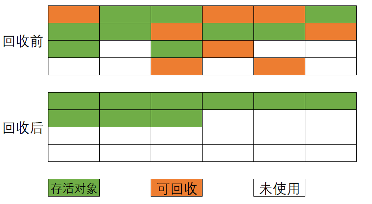 它将可用内存划分为两块,每次只使用其中的一块。当这一块的内存用完了,就将还存活着的对象复制到另外一块上面,然后再把已使用的内存空间一次清理掉,这样一来就不容易出现内存碎片的问题。