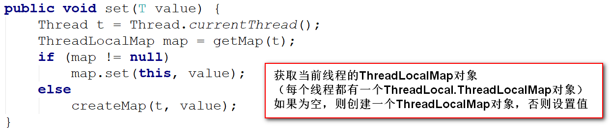 也就是说,每个线程都维护了一个ThreadLocal.ThreadLocalMap类型的对象,而set操作其实就是以ThreadLocal变量为key,以我们指定的值为value,最后将这个键值对封装成Entry对象放到该线程的ThreadLocal.ThreadLocalMap对象中。每个ThreadLocal变量在该线程中都是ThreadLocal.ThreadLocalMap对象中的一个Entry。既然每个ThreadLocal变量都对应ThreadLocal.ThreadLocalMap中的一个元素,那么就可以对这些元素进行读写删除操作。