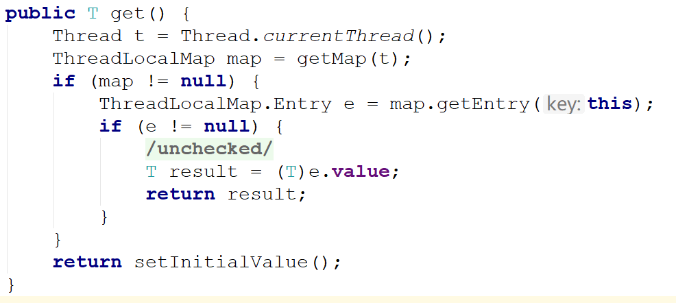 get()方法就是从当前线程的ThreadLocal.ThreadLocalMap对象中取出对应的ThreadLocal变量所对应的值