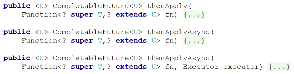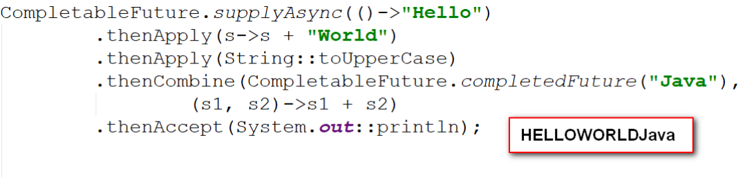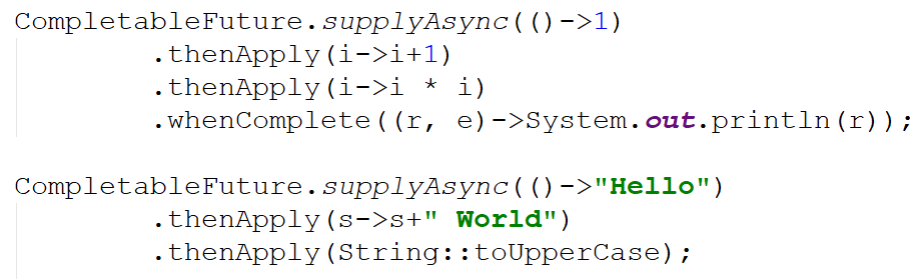 - 一个阶段的计算执行可以是一个Function,Consumer或者Runnable。比如:stage.thenApply(x -> square(x)).thenAccept(x -> System.out.print(x)).thenRun(() -> System.out.println())