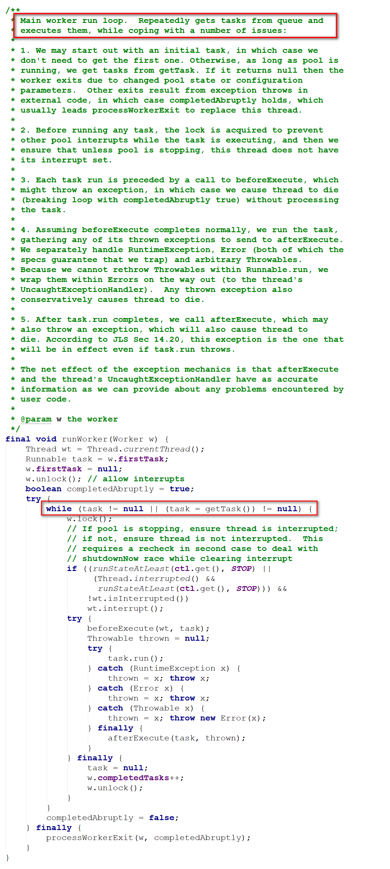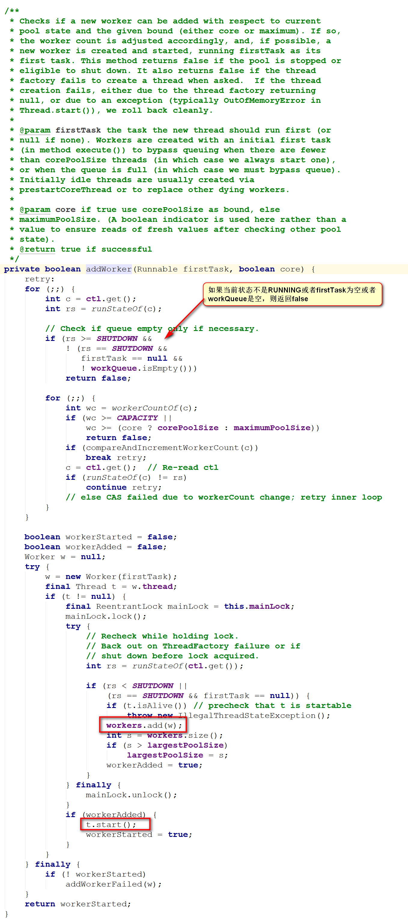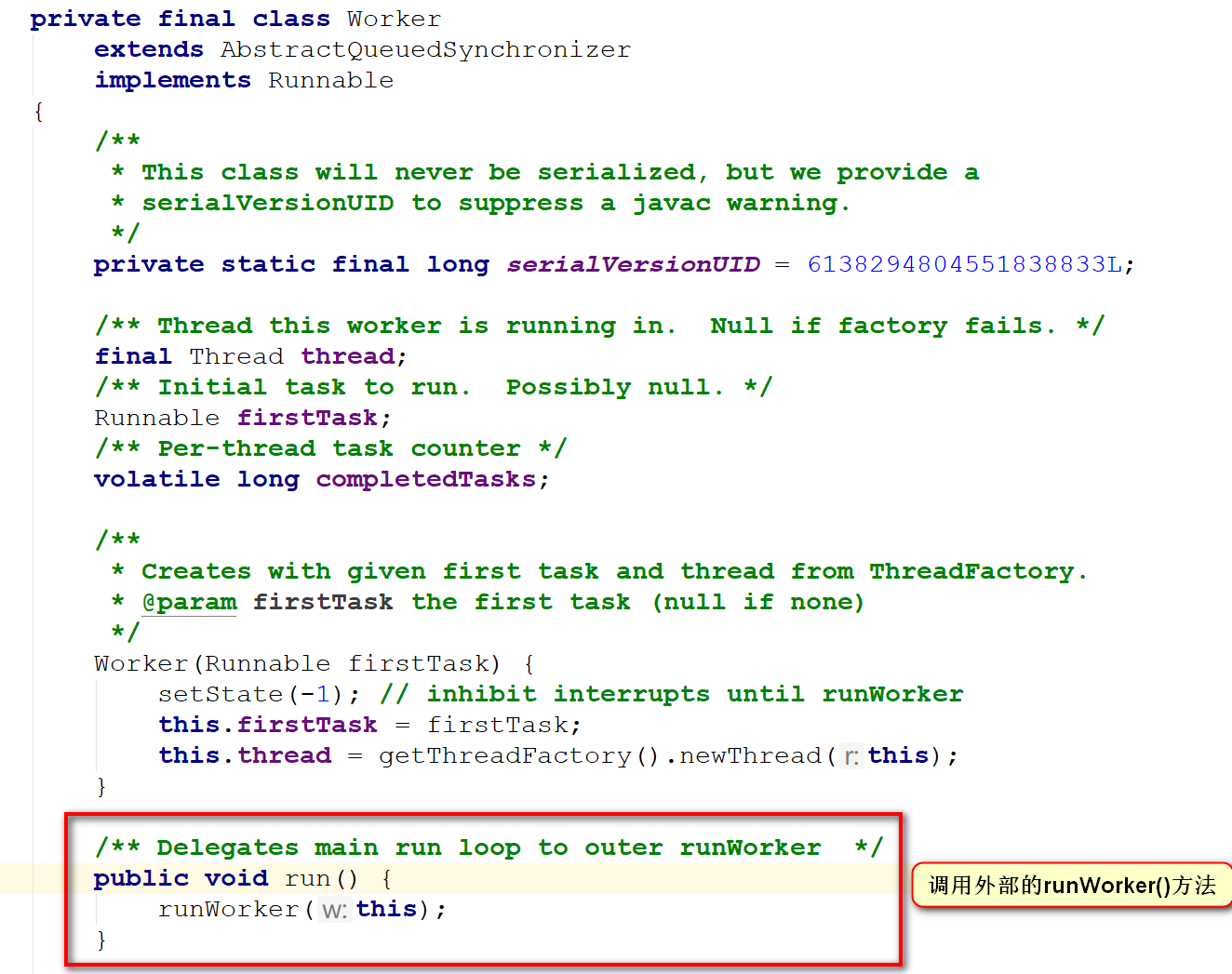 前一步中,线程的start()方法,线程运行的时候执行run()方法,而Worker继承Runnable并重新run()方法,run()方法又调用外部的runWorker()方法,所以,在线程池中新创建的线程运行时调用的是runWorker()方法