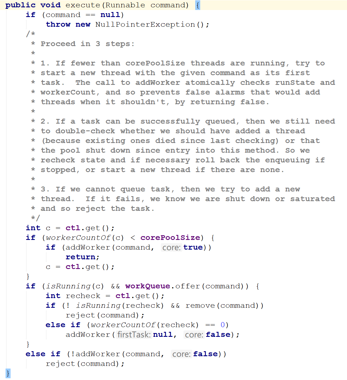 第一处,如果当前有效线程数少于核心线程数,则调用之,此时线程数的边界是核心线程数