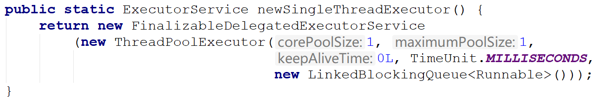 newSingleThreadExecutor:核心线程数和最大线程数都是1,队列是LinkedBlockingQueue