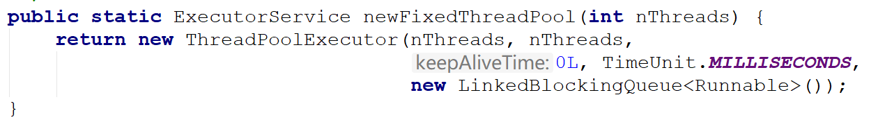 newFixedThreadPool:核心线程数和最大线程数相等,超过核心线程数的空闲线程生存时间是0,队列是LinkedBlockingQueue