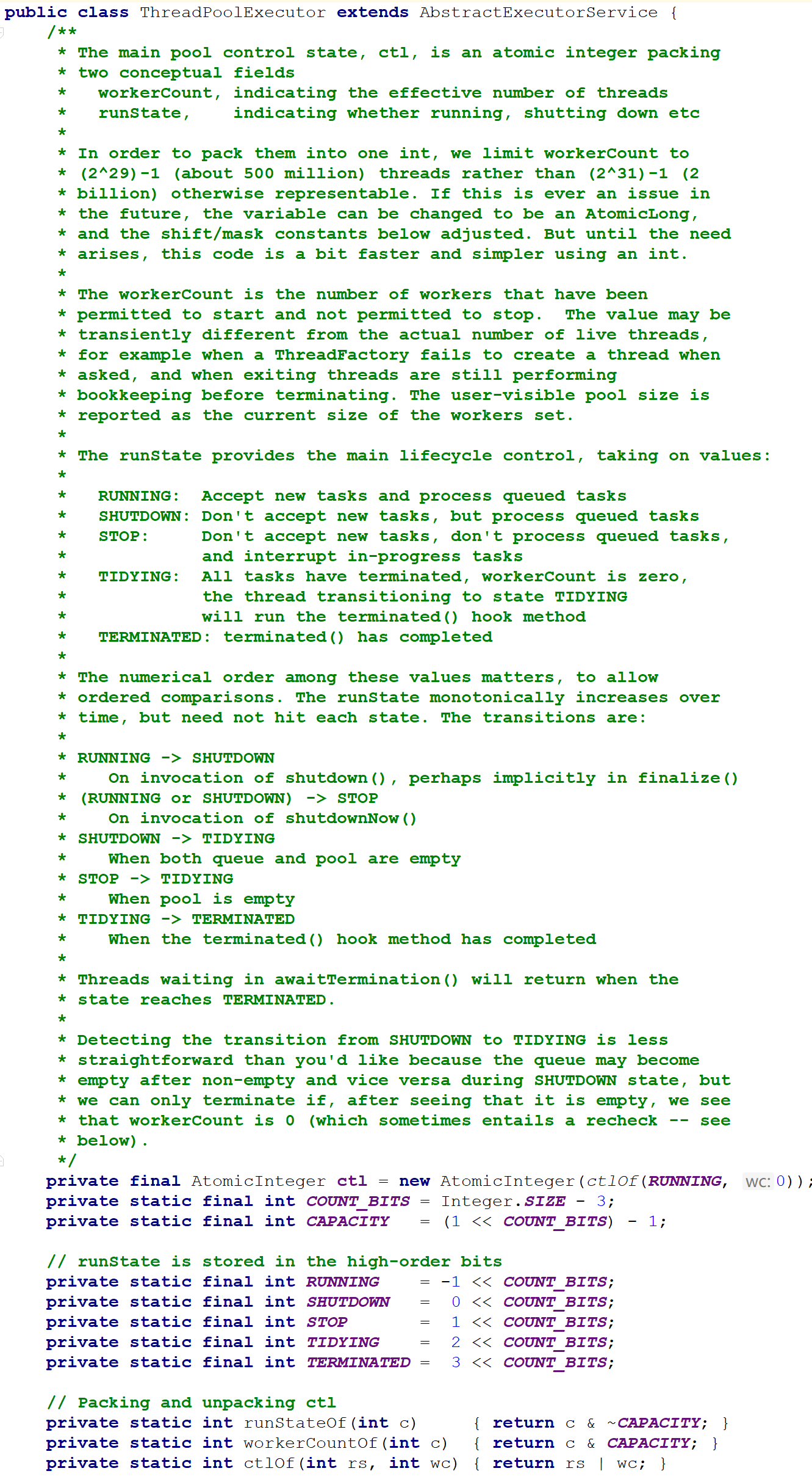线程池主要控制的状态是ctl,它是一个原子的整数,其包含两个概念字段: