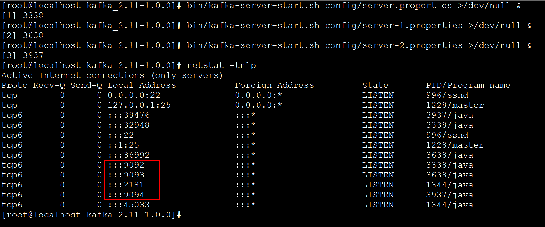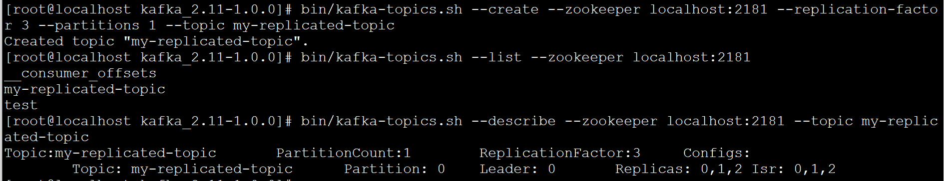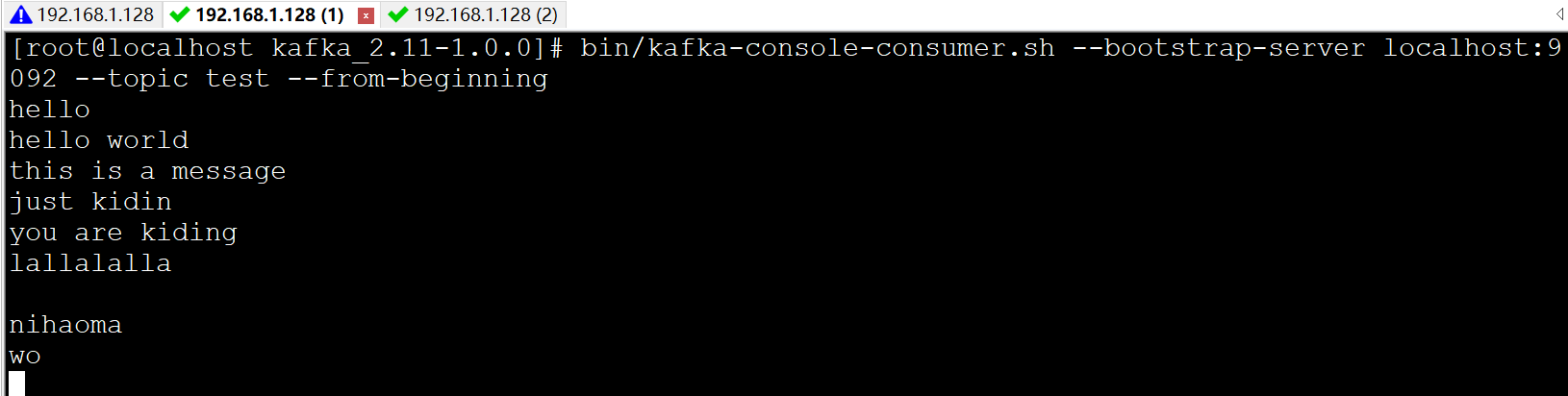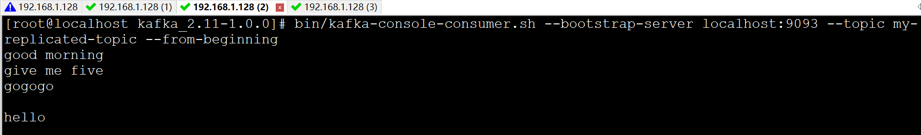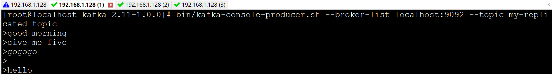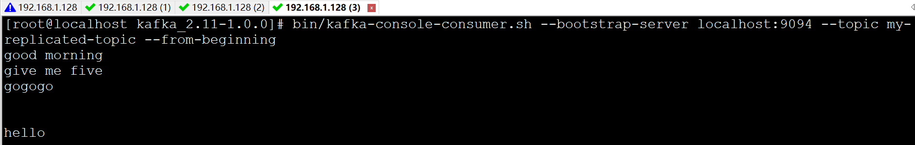 消息是发布到localhost:9092上的,而当连接到localhost:9093和localhost:9094上也能收到消息,由此可见,replication-factor=3的作用
