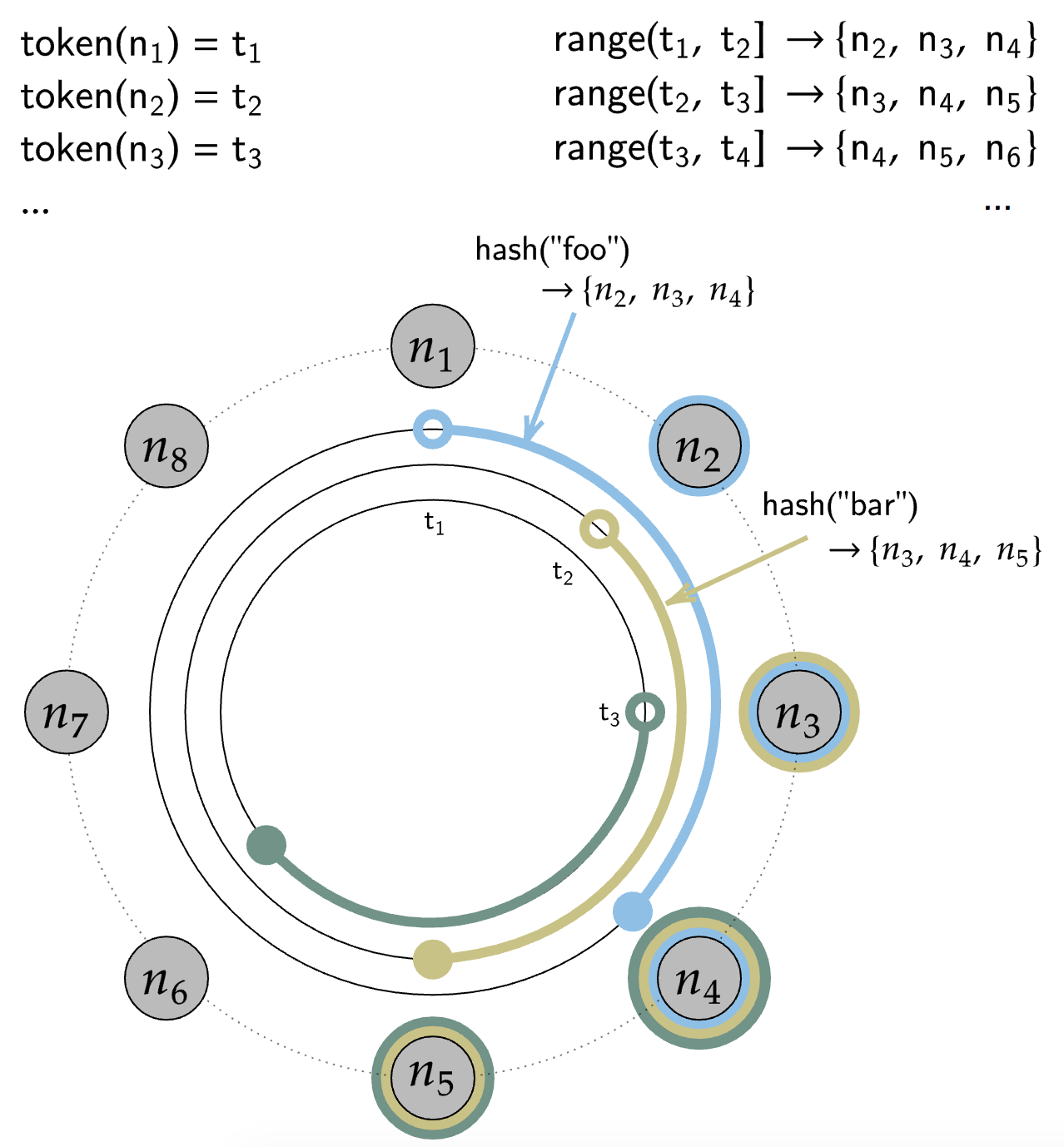 Cassandra将每个节点映射到连续哈希环上的一个或多个token(令牌),并通过将key哈希到环上然后沿一个方向“遍历”环来决定key应该放在什么位置,类似于Chord算法。一致性哈希与原始数据哈希的主要区别在于,当要哈希到的节点(桶)数量发生变化时,一致哈希只需移动一小部分key。