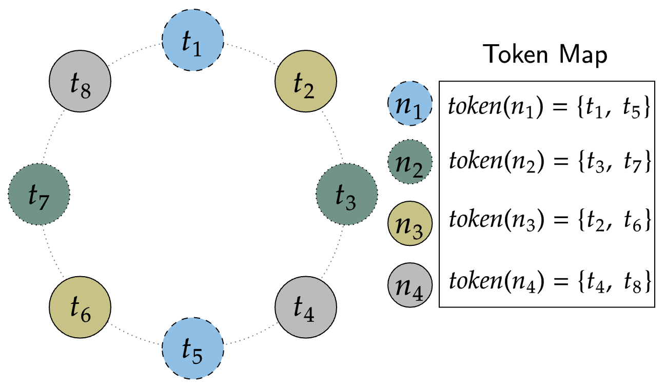 Dynamo论文中提倡使用“虚拟节点”来解决这种不平衡问题。虚拟节点通过将令牌环中的多个令牌分配给每个物理节点来解决该问题。通过允许单个物理节点在环中占据多个位置,我们可以使小型集群看起来更大,因此即使添加单个物理节点,我们也可以使其看起来像我们添加了更多节点。