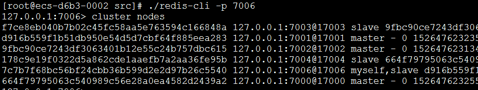 (PS:我在操作的过程中发现,不用add-node命令,直接启动7006以后它就直接加入集群了,不知道是不是因为我是同一台机器上操作,或者是因为只有一个集群,我猜测可能是因为这是一个伪集群,哈哈哈,先不管了。。。)