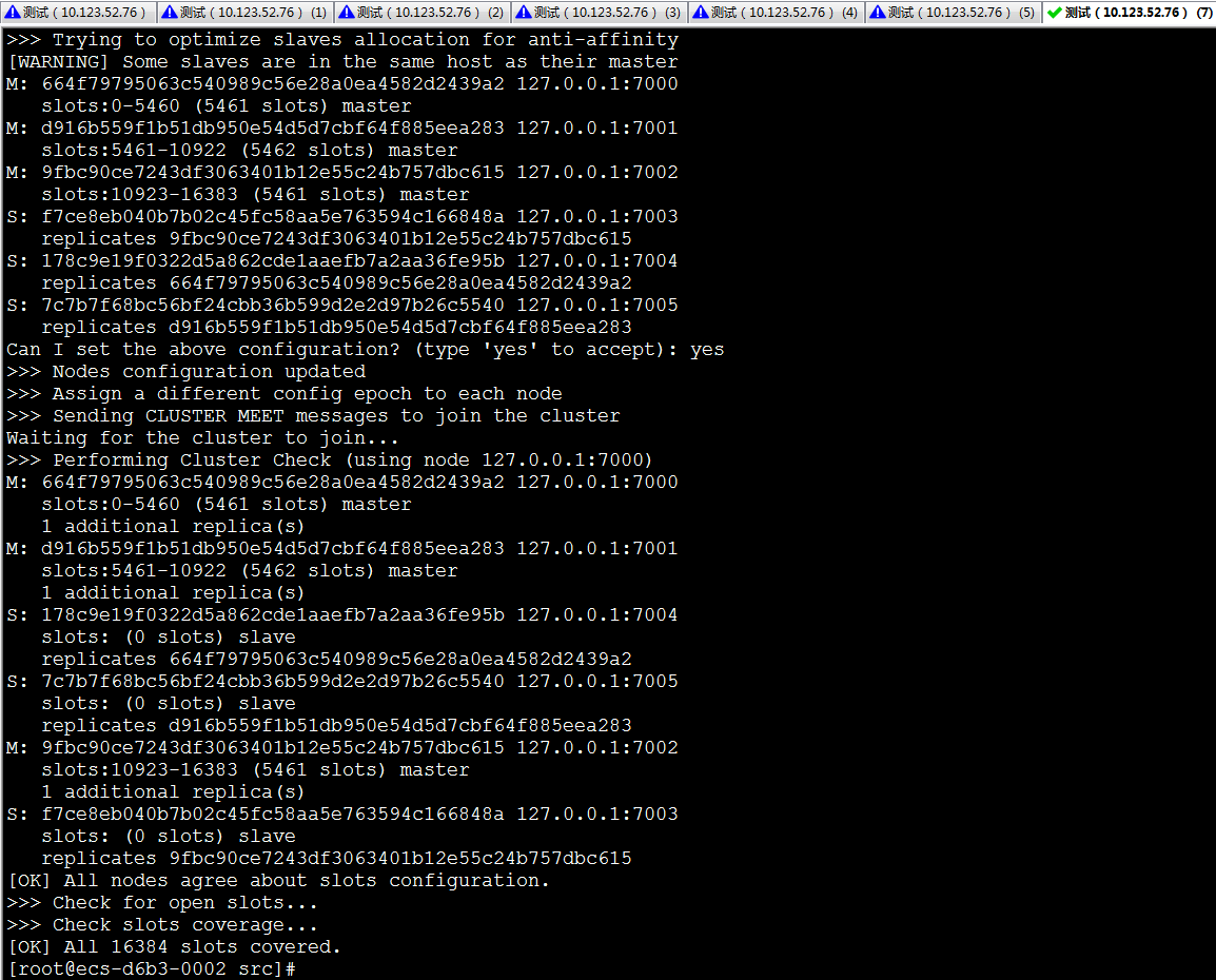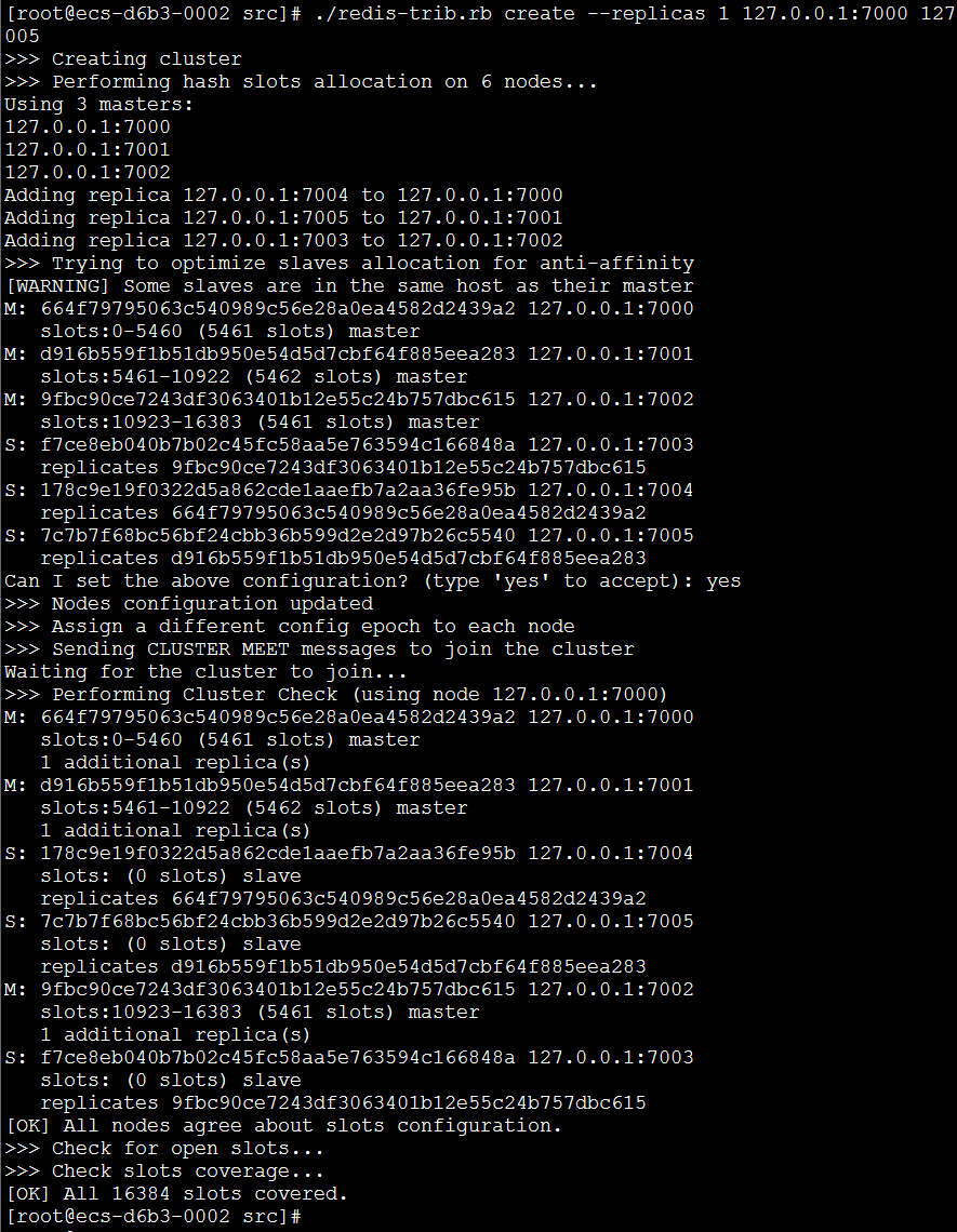 这里,我们使用create命令来创建一个新的集群。选项–replicas 1表示我们想为每个master指定一个slave。其余参数是需要加到集群的实例地址。