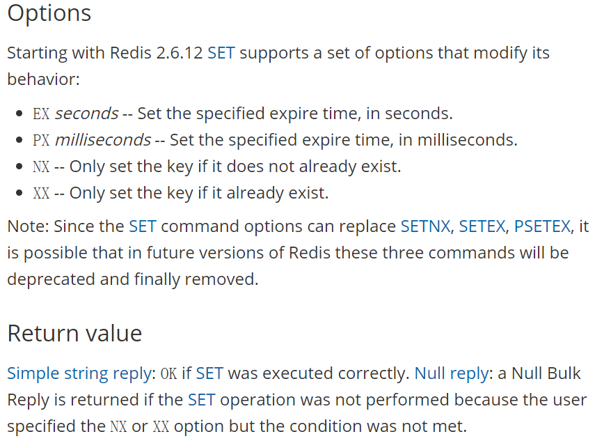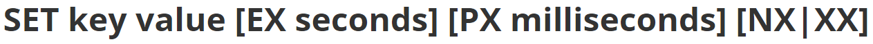 第一种:SET key value [EX seconds] [PX milliseconds] NX