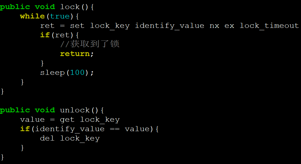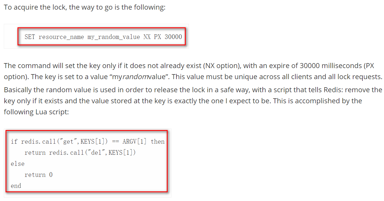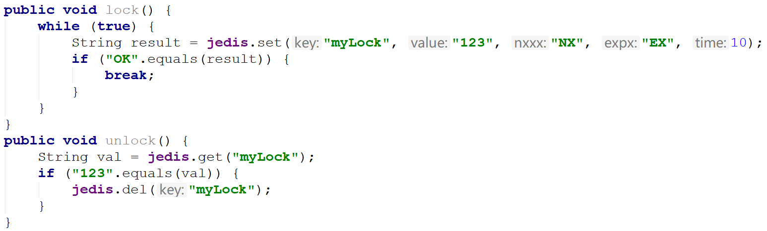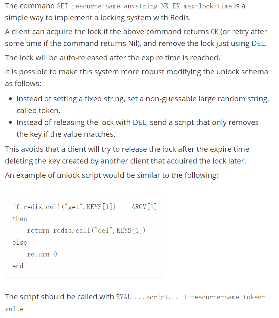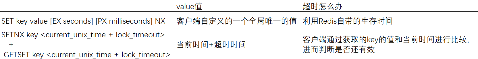 不同之处在于,SET方式只需判断能不能设置成功,删除的时候判断是不是自己设置的,万一超时了利用系统自带的生存时间可以自动释放锁。