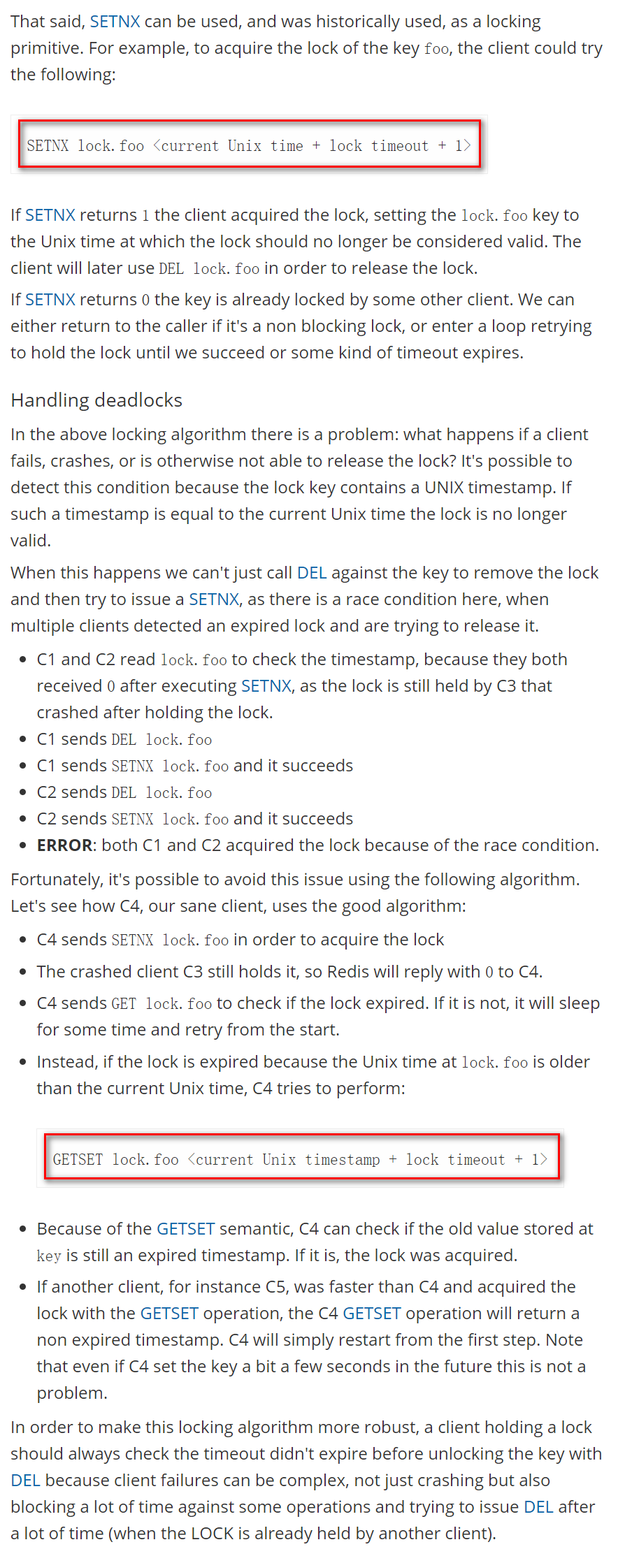 而SETNX+GETSET方式除了需要判断能不能设置成功,在设置失败的时候还要进一步判断其值是否有效,是否超时由客户端自己判断