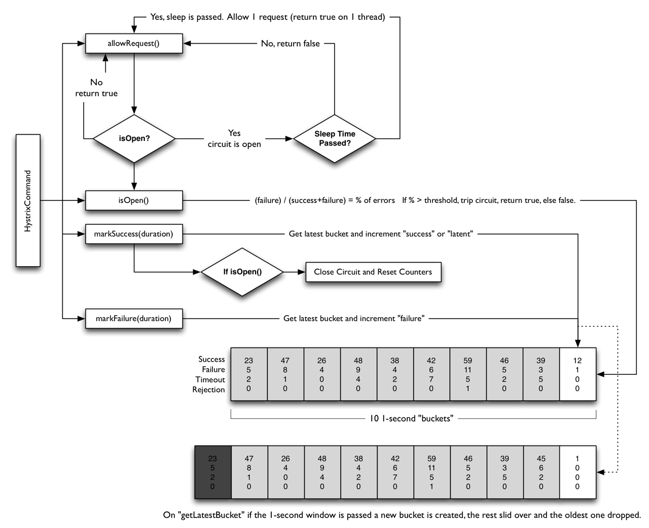 下图显示了HystrixCommand或HystrixObservableCommand是如何与HystrixCircuitBreaker交互的,以及它的逻辑和决策流程,包括断路器中计数器的行为。