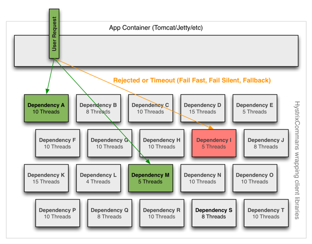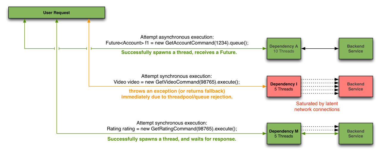 Hystrix使用独立的、每个依赖项的线程池作为约束任何给定依赖项的一种方式,因此底层执行的延迟只会使该池中的可用线程饱和。