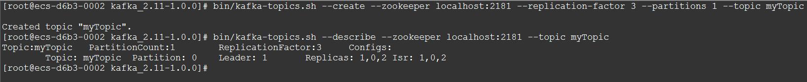 bin/kafka-topics.sh --create --zookeeper localhost:2181 --replication-factor 3 --partitions 1 --topic myTopic