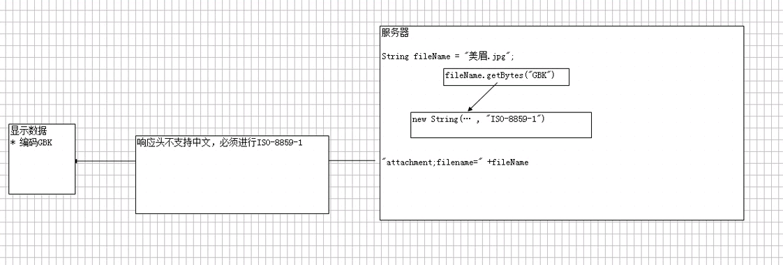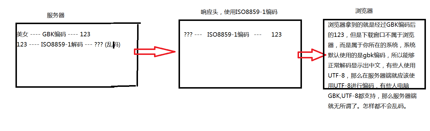 这张图解释了上面这段代码所做的事情,而整个编码过程,我来简单口述一下,在服务器端,写上面这段代码,美女是中文字,将其使用GBK码表进行编码后,就会获得一个计算机认识的符号,比如是123,然后我们在将这个计算机认识的符号,123使用ISO8859-1码表进行解码,变成我们所认识的汉字,但是因为编码和解码所用码表不一样,所以不能正常显示,也就是此时的fileName本身就是一个乱码的文字,然后在响应头中,因为是使用ISO8859-1的码表进行编码,所以fileName本身乱码的文字,就会变为机器认识的123,当到了浏览器端,因为123是由gbk进行编码的,所以如果使用gbk进行的解码的话,就会使其正确的显示,过程就是这样