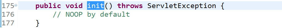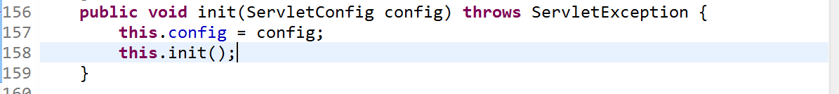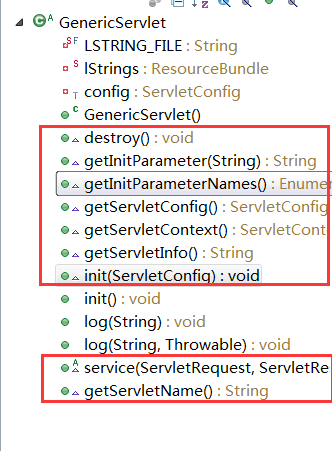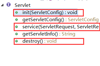 看上图,用红色框框起来的就是实现Servlet和ServletConfig接口所实现的方法,有9个,这很正常,但是我们可以发现,init方法有两个,一个是带有参数ServletConfig的,一个有无参的方法,为什么这样设计?这里需要知道其中做了什么事情,来看看这两个方法分别做了什么事?