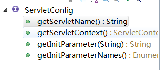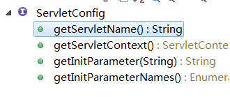 从这里可以看到,Servlet生命周期的三个关键方法,init、service、destroy。还有另外两个方法,一个getServletConfig()方法来获取ServletConfig对象,ServletConfig对象可以获取到Servlet的一些信息,ServletName、ServletContext、InitParameter、InitParameterNames、通过查看ServletConfig这个接口就可以知道