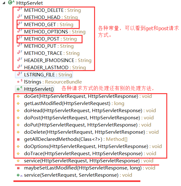 这个方法就是判断浏览器过来的请求方式是哪种,每种的处理方式不一样,我们常用的就是get,post,并且,我们处理的方式可能有很多的内容,所以,在该方法内会将get,post等其他5种请求方式提取出来,变成单个的方法,然后我们需要编写servlet时,就可以直接重写doGet或者doPost方法就行了,而不是重写service方法,更加有针对性。所以这里就回到了我们上面编写servlet时的情况,继承httpServlet,而只要重写两个方法,一个doGet,一个doPost,其实就是service方法会调用这两个方法中的一个(看请求方式)。所以也就解答了我们一开始提的问题3。