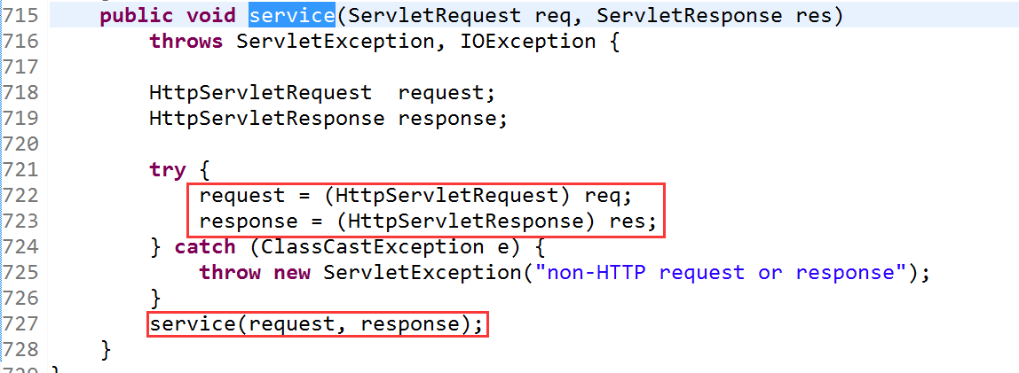 关注service(HttpServletRequest req, HttpServletResponse resp)方法和service(ServletRequest req, ServletResponse res)方法。