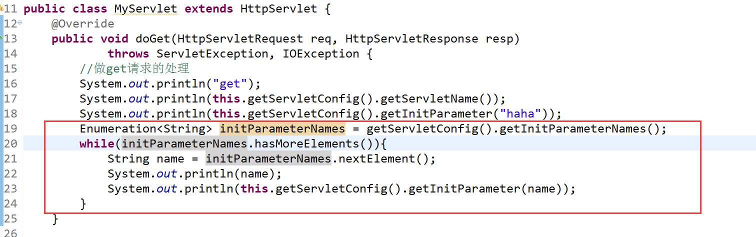 getInitParameterNames(); //获取在Servlet中所有初始化参数的名字,也就是key值,可以通过key值,来找到各个初始化参数的value值。注意返回的是枚举类型