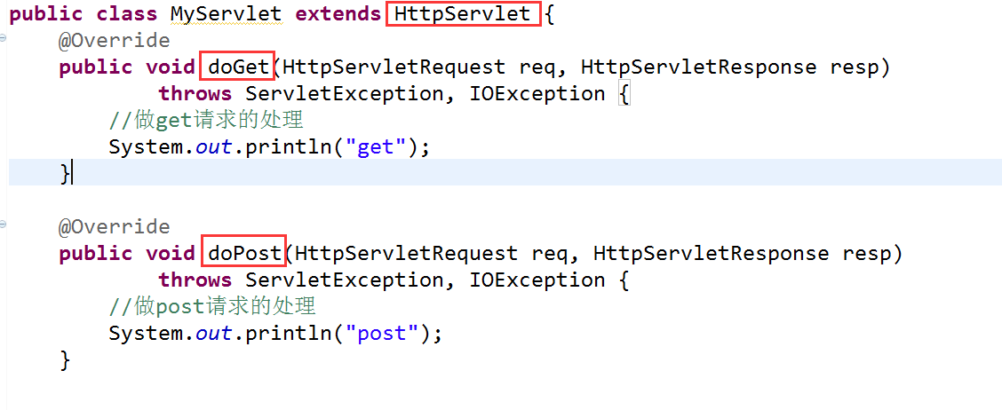 1、创建一个MyServlet继承HttpServlet,重写doGet和doPost方法,也就是看请求的方式是get还是post,然后用不同的处理方式来处理请求,